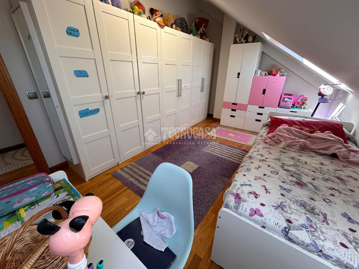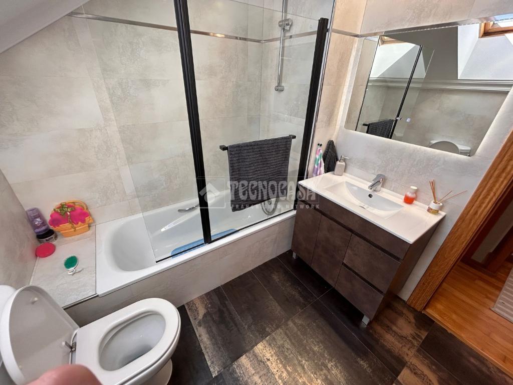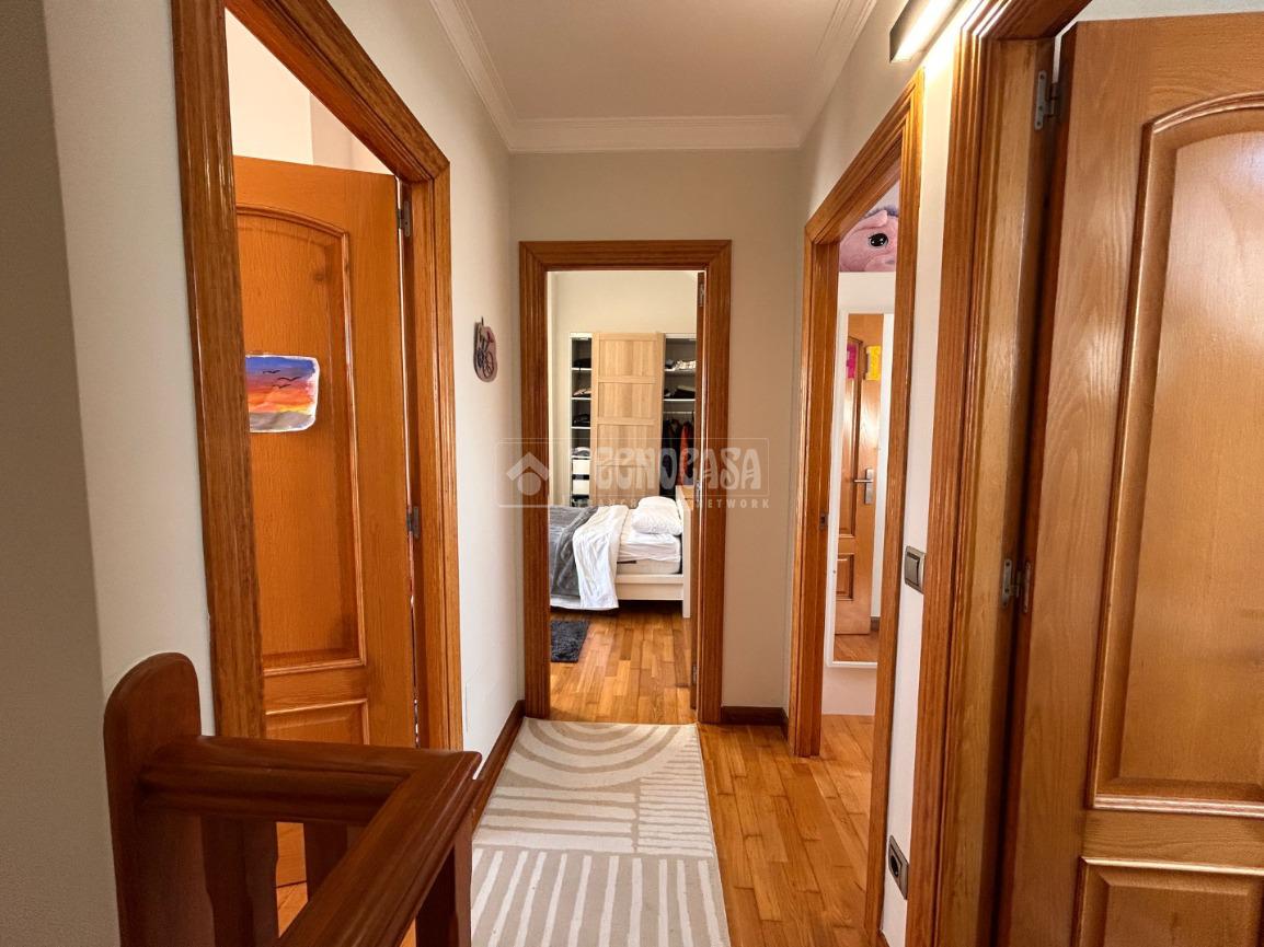 En la planta superior se ubican tres dormitorios y dos baños: uno de los dormitorios cuenta con baño en suite (cuatro piezas, bañera y ventana) y acceso a una terraza privada. Los otros dos dormitorios (actualmente sala de juegos y dormitorio infantil) comparten un segundo baño completo con bañera y ventana.