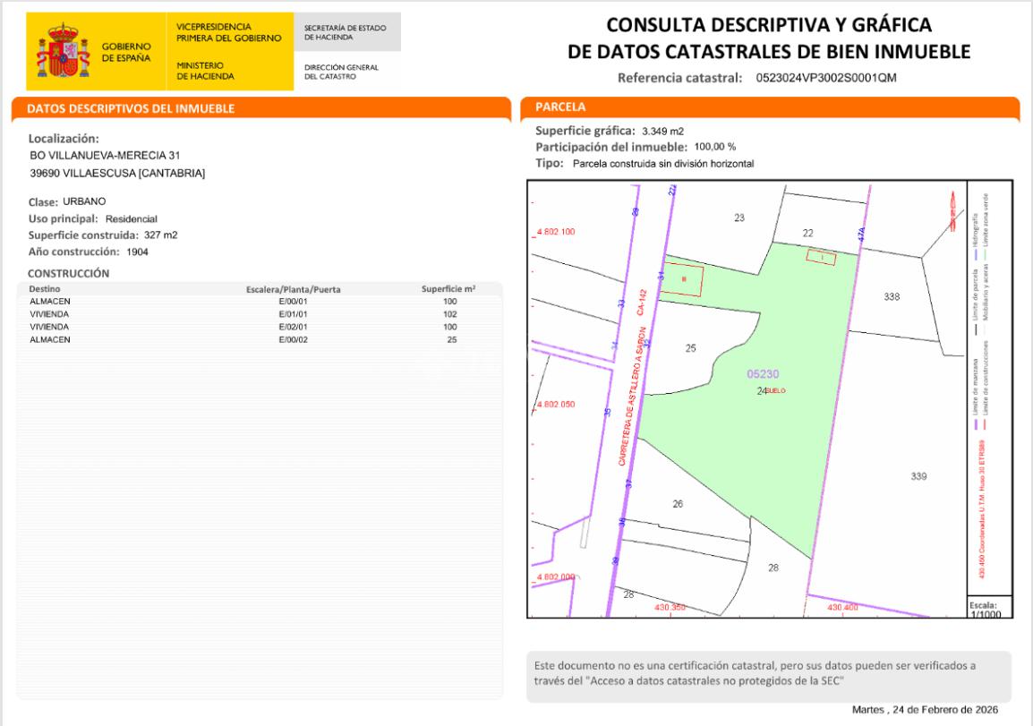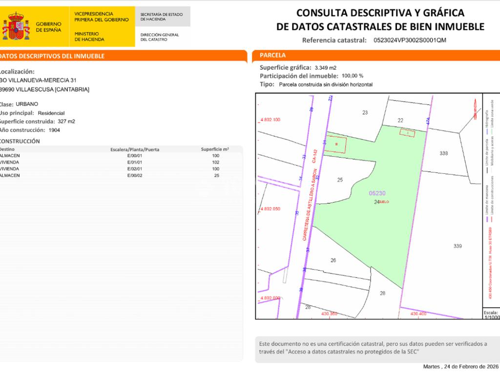 Se vende terreno urbano edificable de 3.349 m² con edificabilidad del 0,5 y acceso directo desde la carretera principal de Villanueva. La parcela incluye un edificio ya construido de tres alturas, ideal para reformar, ampliar o transformar según necesidades.